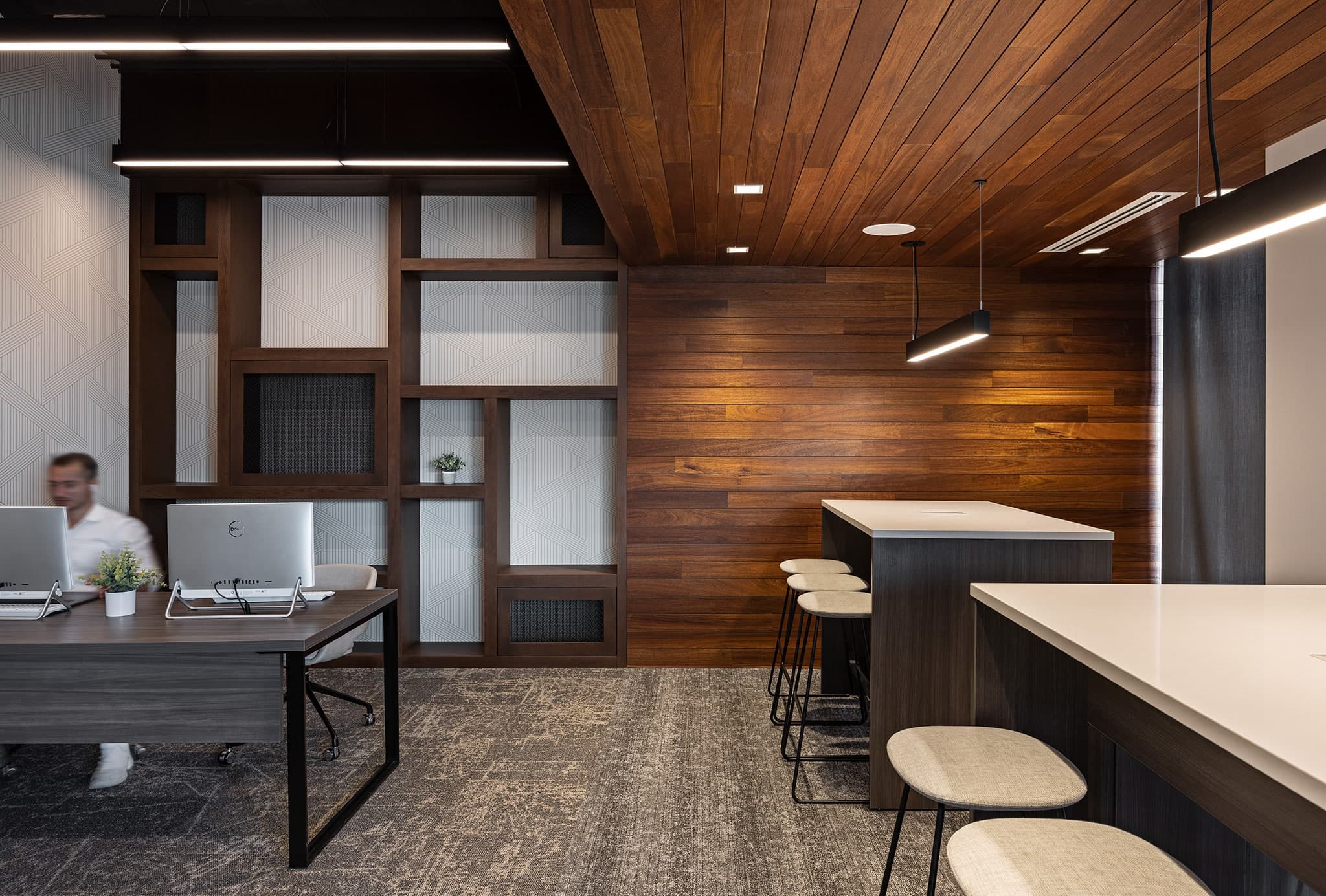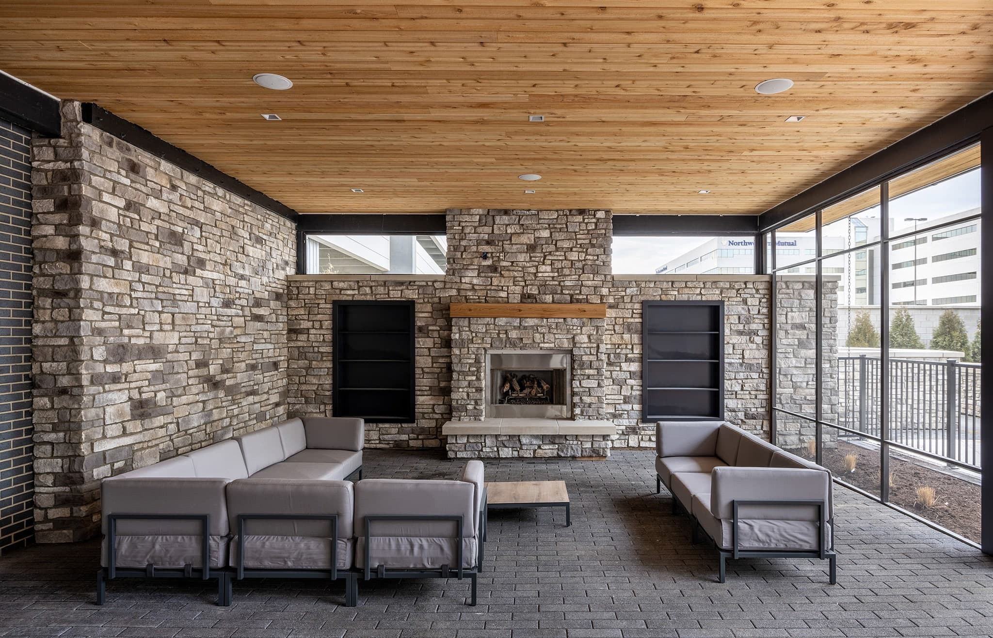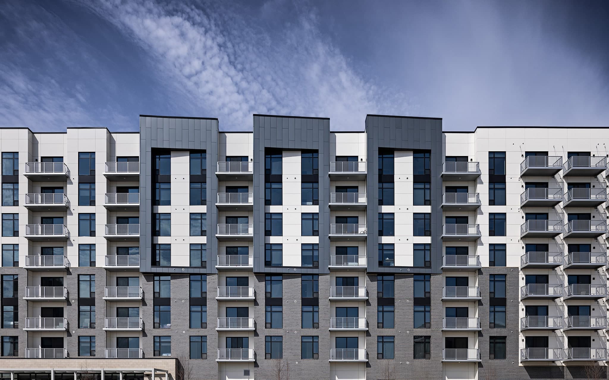 The owner asked for a sleek and sexy building with materials that remind him of a Porsche. We designed the building to have sharp angles with dramatic lines. A highlight is the exaggerated glass canopy to welcome residents. To enhance the modern feel both inside and outside, every unit has floor to ceiling windows. Materials chosen for the outside of the building include high-end brick, metal panels, glass, and steel. One of our favorite features is the courtyard. The building wraps around a large outdoor amenity that contains a pool, cabanas, fire pit, outdoor kitchen, and meditation garden.