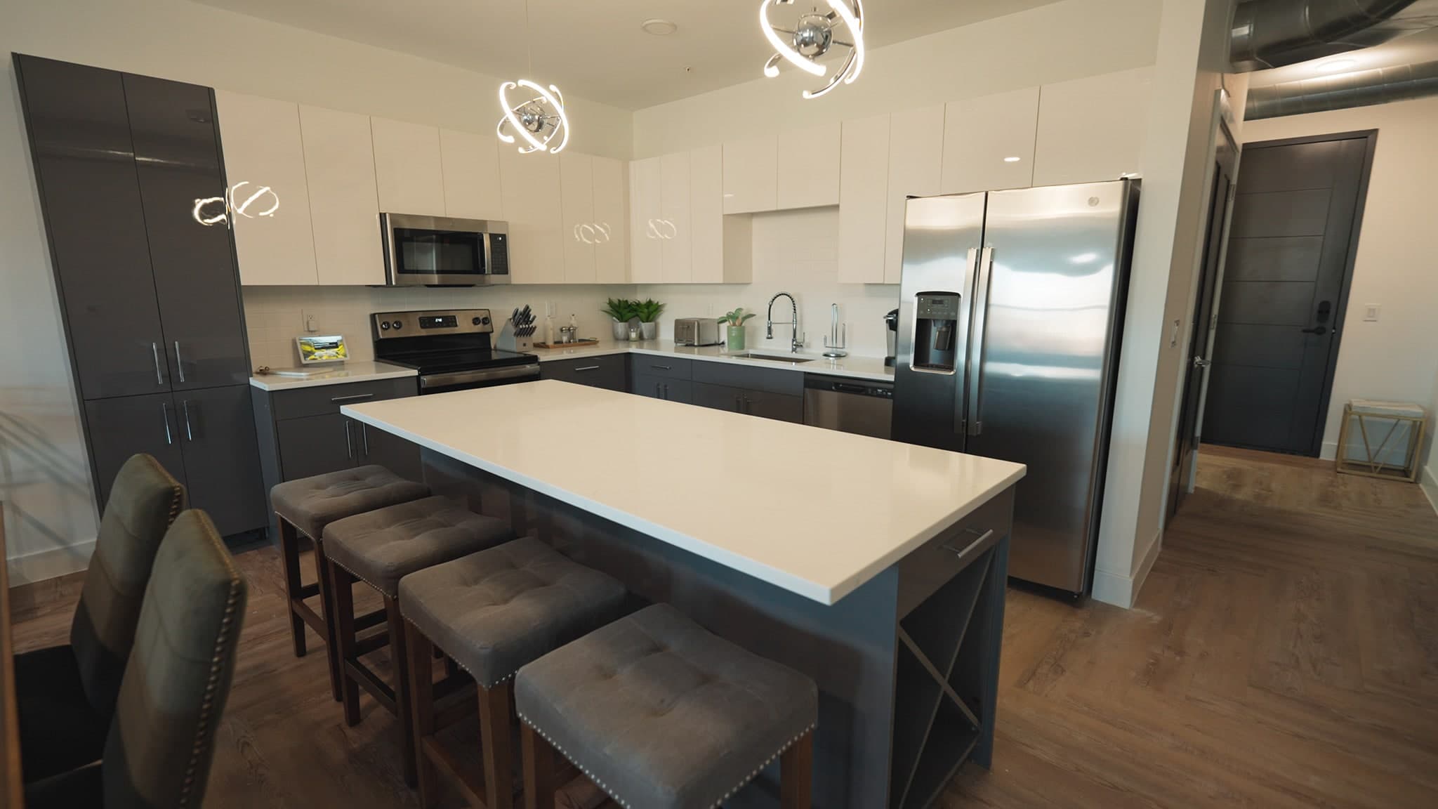 Amenities include a grade level clubhouse, fitness center, streetside patios, and covered parking on the first floor.
